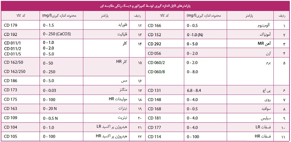 • سنجش پارامتر‌های آب به کمک کمپراتور‌، دیسک رنگی و معرف‌های شیمیایی مربوطه به‌روش چشمی